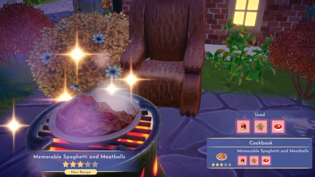 After adding all three ingredients, start cooking to make a Memorable Spaghetti and Meatballs dish. Now, head back to Lady and Tramp’s House to give the dish to Lady.