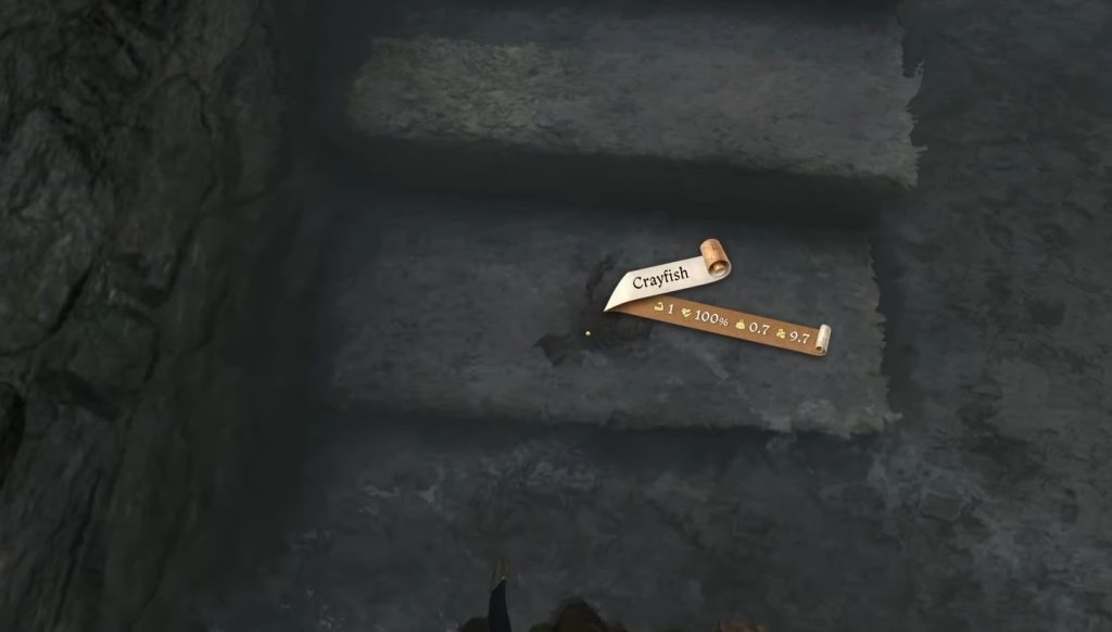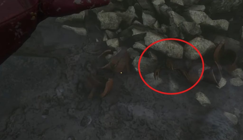 Move to the middle water pool and go to the bottom side to spot a plethora of rocks and broken pots. Crayfish will be under the rocks beside the broken pots. Follow the clicking sound and crouch to spot the crayfish.