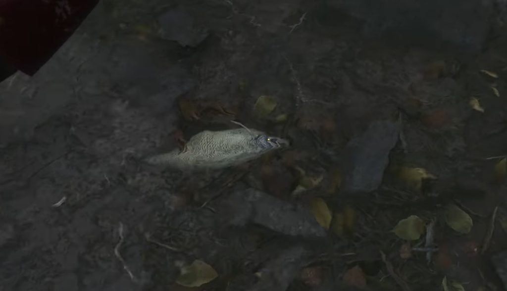 Move to the leftmost water pool and go to the bottom side to spot a dead silver fish. The crayfish will be eating the dead silver fish inside the water.