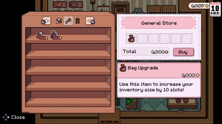 Once you have made enough money, make your way to the General Store and go to the counter to browse the wares. The General Store offers various crop seeds, furniture items, and tools. Navigate to the Tools tab to find the Bag Upgrade. Purchasing it will increase the inventory slots by 10 and add an additional hotbar that can be switched by pressing the Tab key.
