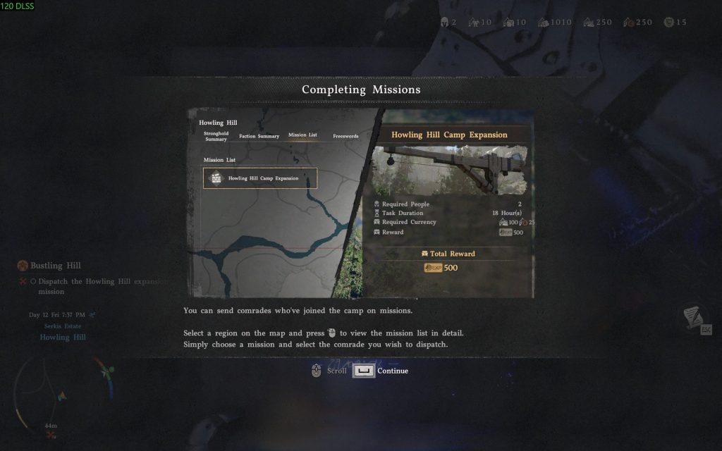 That is all you have to do to trigger the dispatch mission. Now, you have to wait for the “Expand Howling Hill” mission to complete. It will take about a day (in-game). To do it quickly, head to the tent at the camp and sleep for 12 hours. It will push the completion to 66%. After that, just wait or do some exploration until the mission is completed.