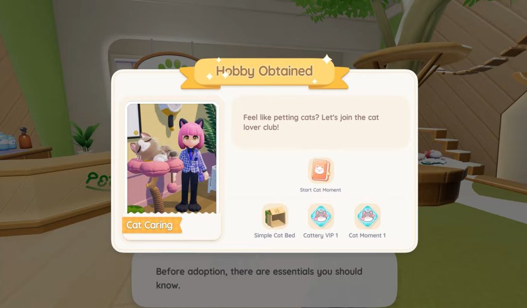 After submitting the Hobby Expansion Ticket, speak with Mrs. Joan again to initiate the adoption process. You can choose 1 cat from three breeds. Choose your cat, name them, and select the ‘adopt’ option to complete the process. Once done, the pet will be sent to your home.