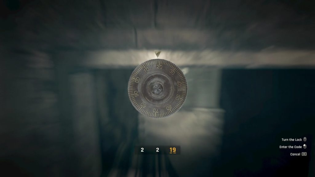 Here, you will find a fuse box with a burnt fuse in it. Interact with it to replace the fuse to power up the bunker. Now, enter the room on your right, and there will be a small safe at the back of the room. To open the safe, you will need a combination of codes. The correct code for the safe is “2, 2, 19”. You can find this code on the Bunnies Poster in the very room.