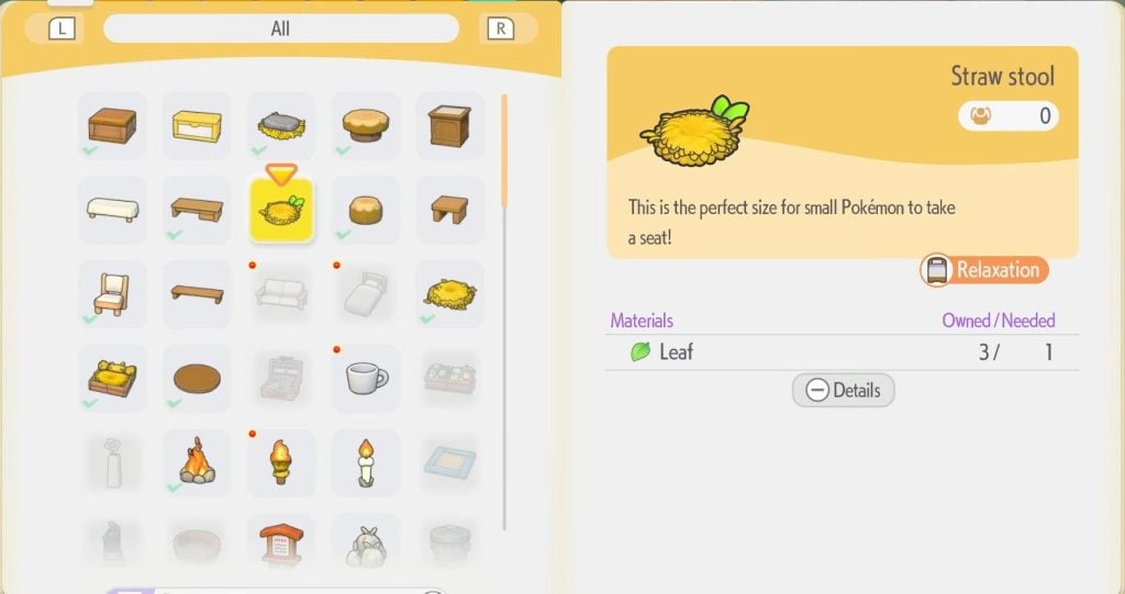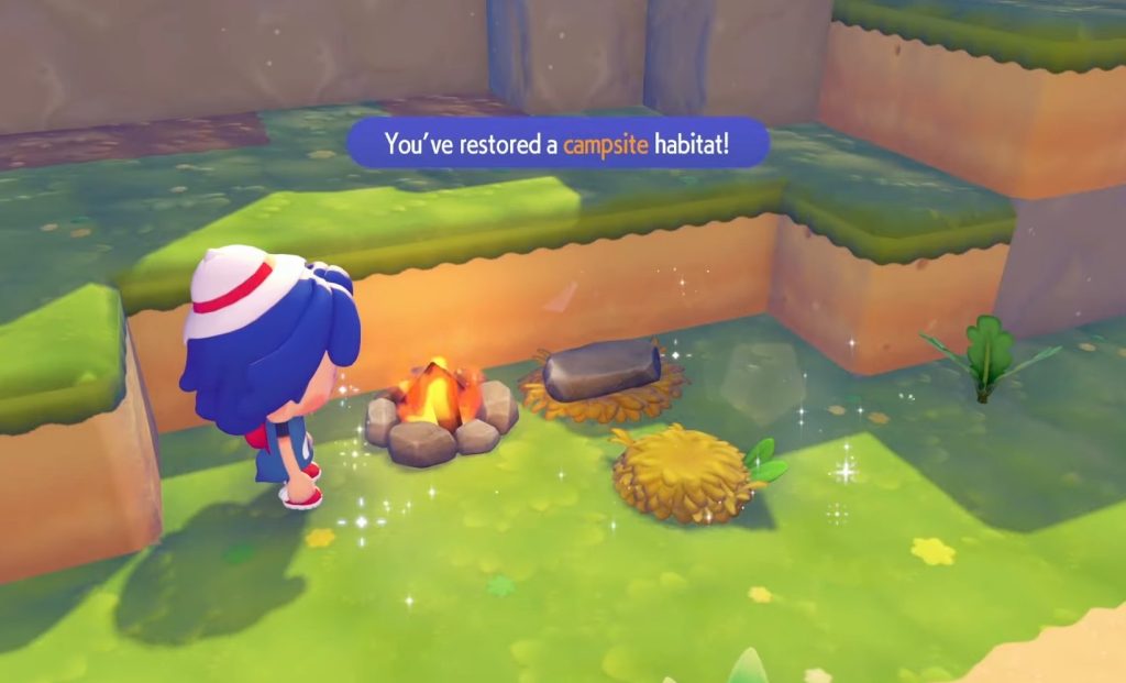 Now, place the items on the ground, and put the Campfire next to the Straw Table, like in the habitat information. Moreover, make sure that the campfire is lit up. You can ask Charmander to help you light the campfire. Once done, the place will be highlighted, restoring the campsite habitat.