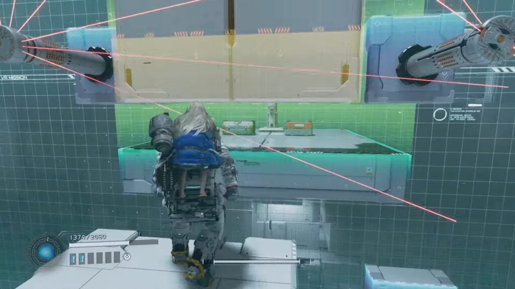From the starting point, continue along the platforms and climb up to find a hacking panel. Hack the panel to take the lift up. Continue ahead to spot the lasers. Jump and use the thrusters to avoid getting hit by the lasers, and make your way to the bigger platform at the end with another hacking panel.