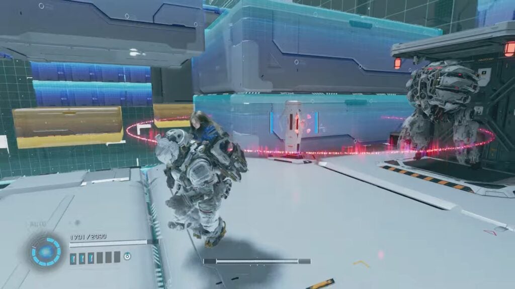As you step on the platform, four Crushers will appear. You can either defeat these Crushers and then proceed ahead, or simply hack the panel to activate the platforms ahead. It is up to you how you want to tackle this situation. The impact barrier can help you create some space and then defeat each crusher individually. Once done, hack the panel to activate the moving platforms. Jump and use the thruster to reach the platform. Moreover, be careful of the lasers, and use the dash in the air to reach the platform at the end.