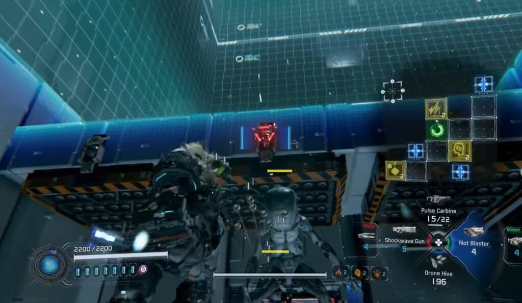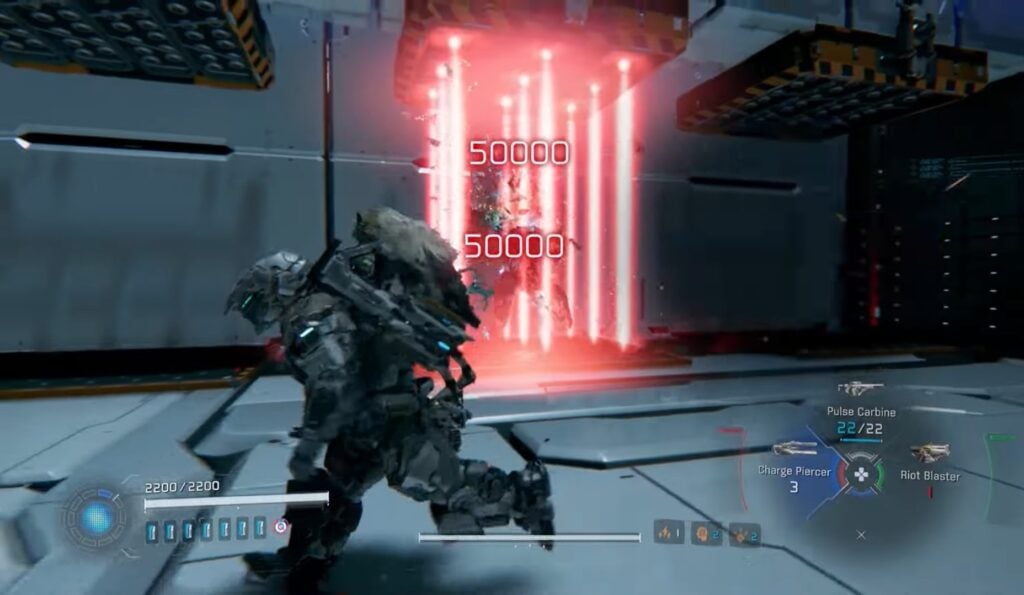 As you spawn in, you will see two doorways with lasers. Hack the right panel to turn off the lasers in the right doorway. Pick up some Lunafilament from the chest in the doorway and enter the first room. In this room, you will get to fight Walkers, an Executor, and a Lancer. Deal with the walkers first with your weapons, and then make use of the Recycler on the top to deal with the Executor and the Lancer. However, you can only activate the Recycler once, so make it count. Lure the enemies underneath the Recycler, and then turn it on by hacking the panel.