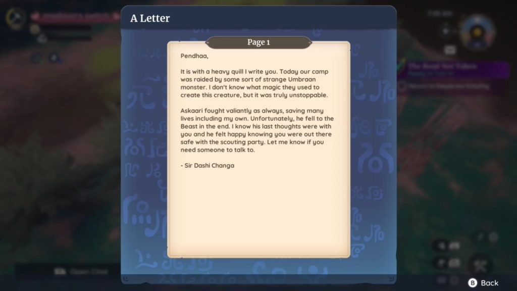 After speaking with the Desperate Echoling, go over to the table on the left and read the letter. It will be the letter from his captain about the monsters raiding the camp. Now, go back and speak with the echo. Here, you need to give him some options to hope to change the outcome. Choose any option you see fit to continue ahead.
