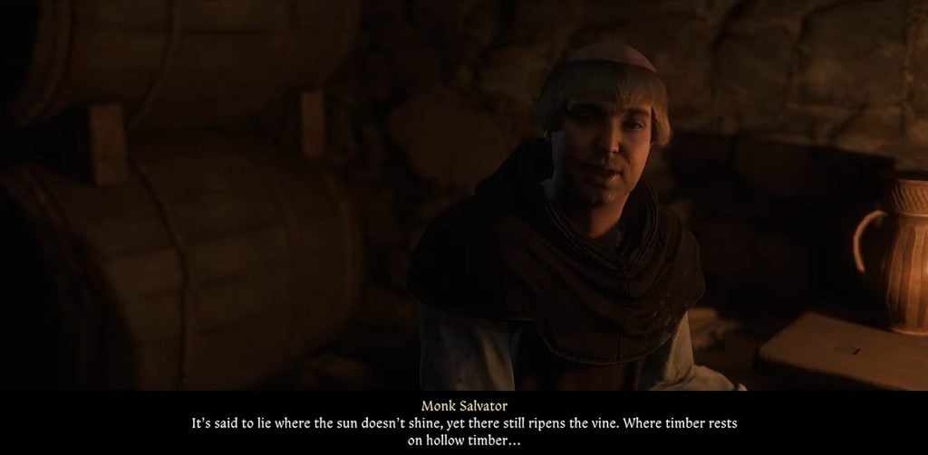 The location of Monk’s Die or Blessed Die is hinted at by a riddle told by Monk Salvator and Gregory. “It’s said to lie where the sun doesn’t shine, yet there still ripens the vine. Where timber resets on hollow timber… And then it’s the fourth one from the left.” However, for them to tell you this riddle, you must defeat the monks in a game of dice. Agree to play dice for the blessed die at a price of 30 Groschen. Once you defeat them, they will reveal the riddle.