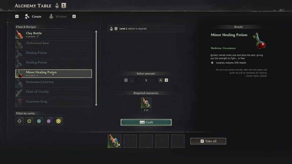 Initially, the Alchemy Table will be Level 1, meaning you will only be able to craft “Uncommon” potions. To craft a better rarity potion, you will have to upgrade the Alchemy Table to Level 2, Level 3, and Level 4. The Level 2 and 3 Alchemy Table station allows you to craft “Rare” potions, and the Level 4 allows you to craft “Epic” potions.