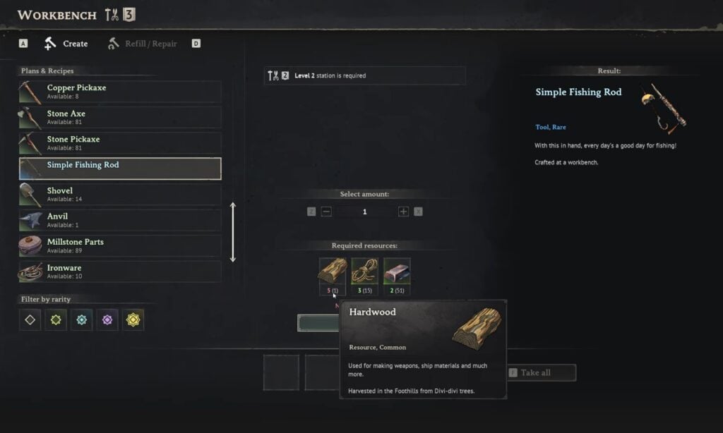 The next step is to gather the materials necessary for crafting the Simple Fishing Rod. While you are in the Foothills biome, make sure to gather Hardwood and Foothills Iron Ores, as you will be needing these resources. Moreover, make sure that your Workbench is Level 2; otherwise, you cannot craft the simple fishing rod. Here are all the resources that you will need to craft a Simple Fishing Rod.