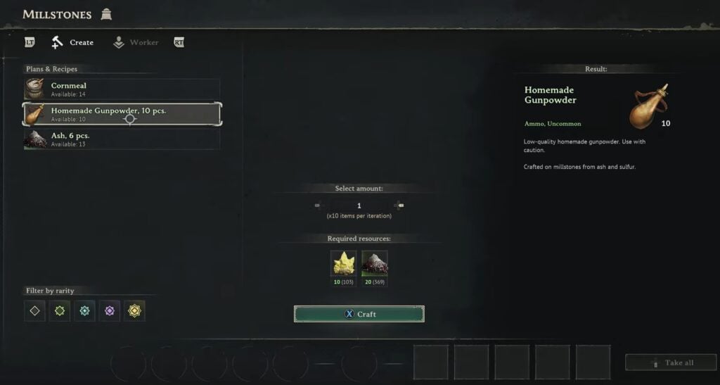 Now that you have the Millstones, you can finally craft the Gunpowder. Interact with the Millstones to find the “Homemade Gunpowder” recipe. Select it, and you can craft 10x Gunpowder with 10x Sulfur and 20x Ash.