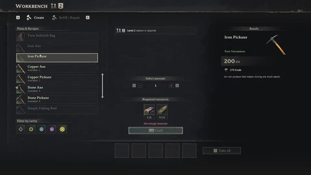 The Gunpowder recipe unlocks automatically by gathering Sulfur in the Foothills biome. It is a common resource found in the rock deposits. To get the Sulfur, you have to mine the rock deposits using at least the Iron Pickaxe. This means that before you can get Sulfur, you would have to do a lot of work, including completing the Coastal Jungle biome, mining Iron Ore in the Foothills biome, upgrading the Workbench to Level 2, and crafting the Iron Pickaxe. It will cost the following resources to craft an Iron Pickaxe.